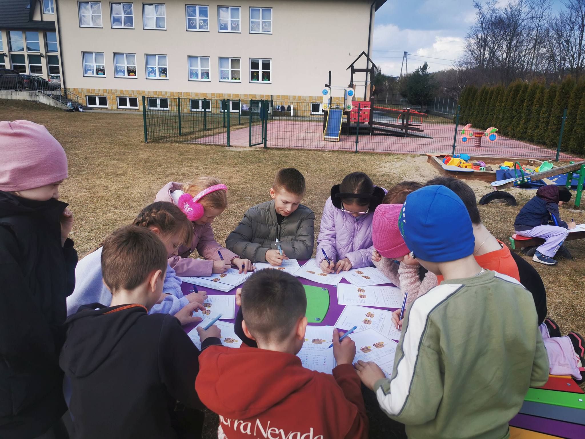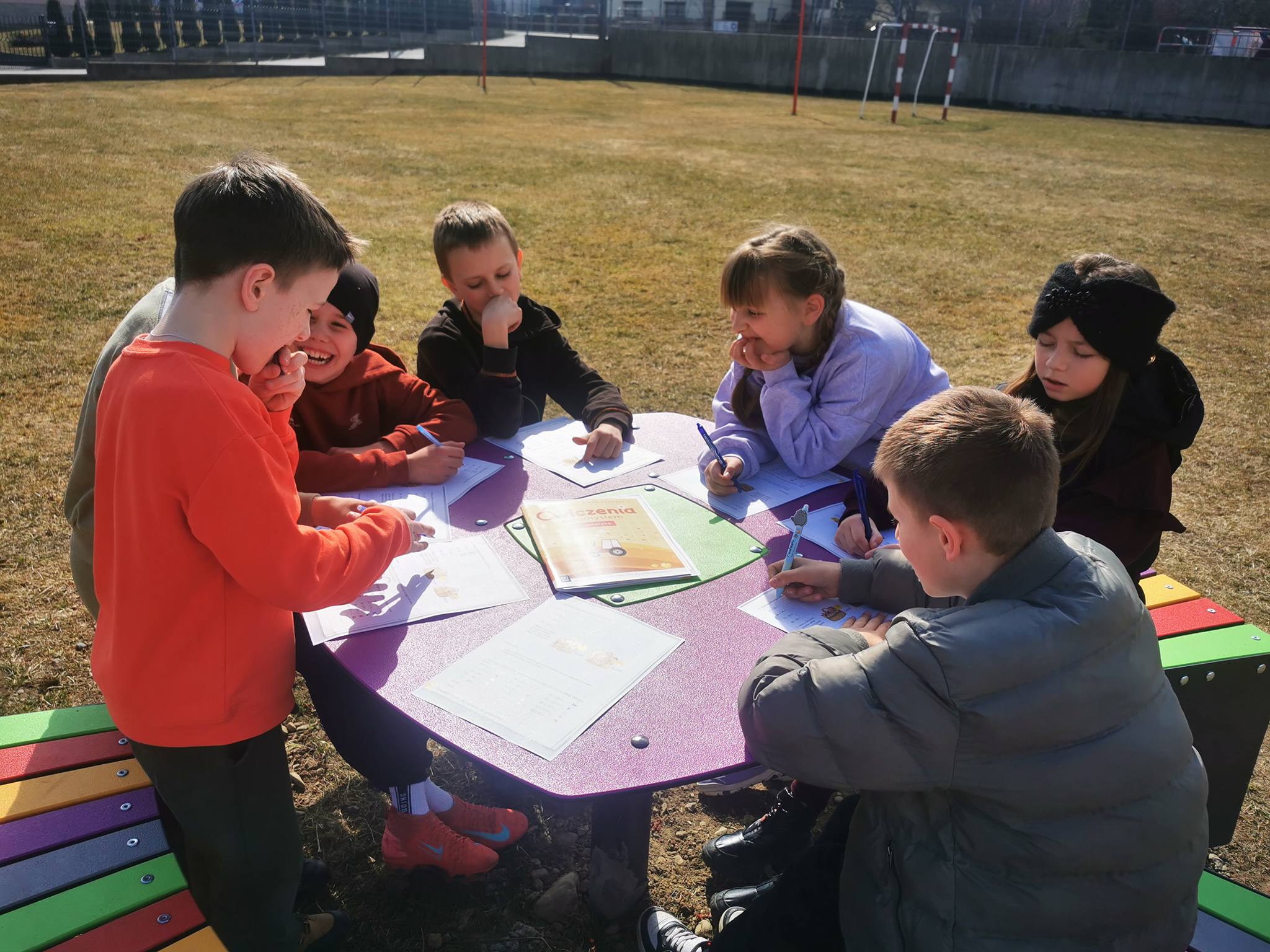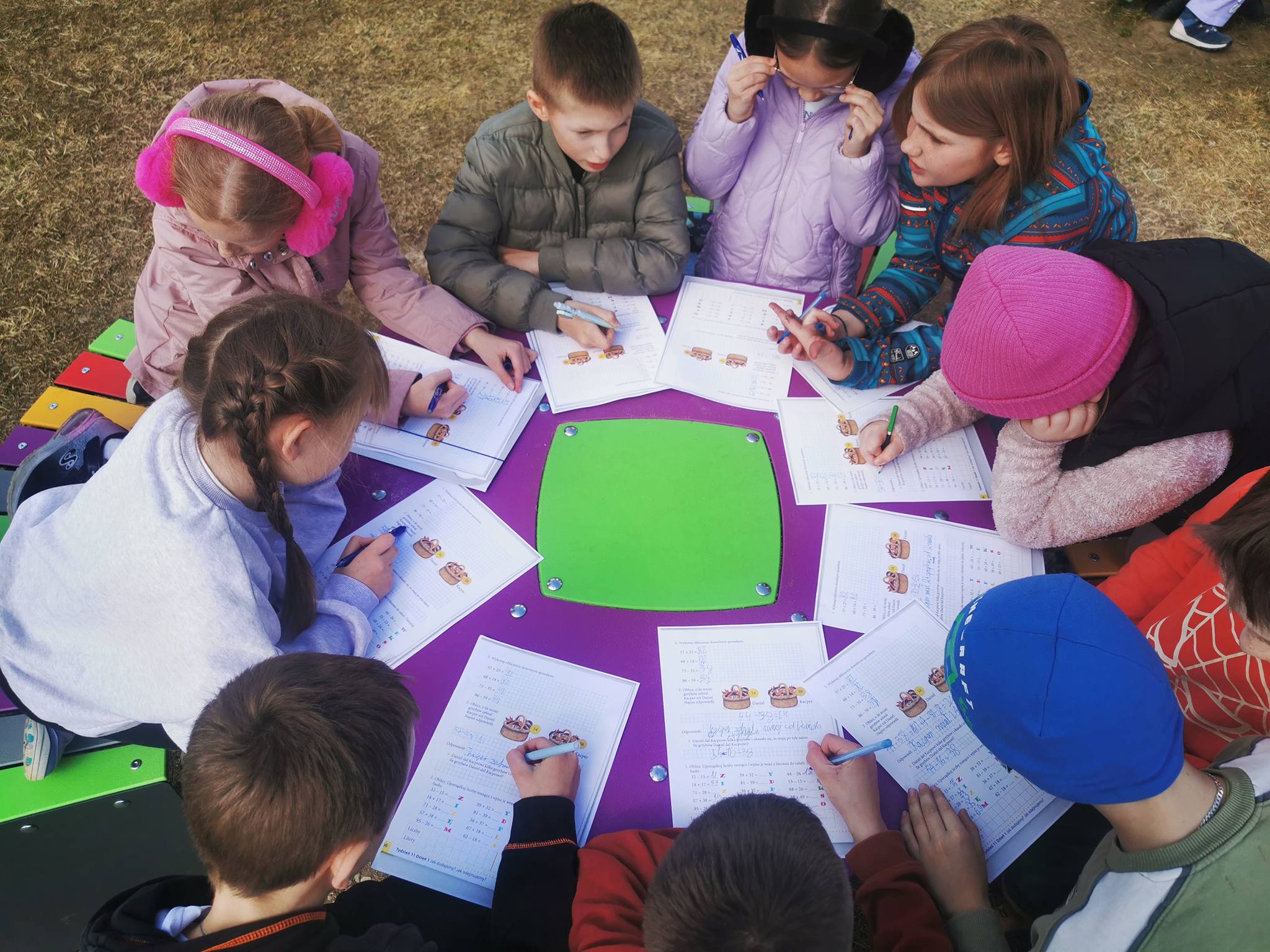 Matematyka na świeżym powietrzu, poza klasą. Uczniowie wykonują różne zadania matematyczne, wykorzystując otoczenie, mierzą odległości, szukają figur geometrycznych w swoim otoczeniu. Dzięki temu łatwiej zrozumieć, jak matematyka działa w codziennym życiu. Taka forma nauki jest ciekawsza i bardziej aktywna.